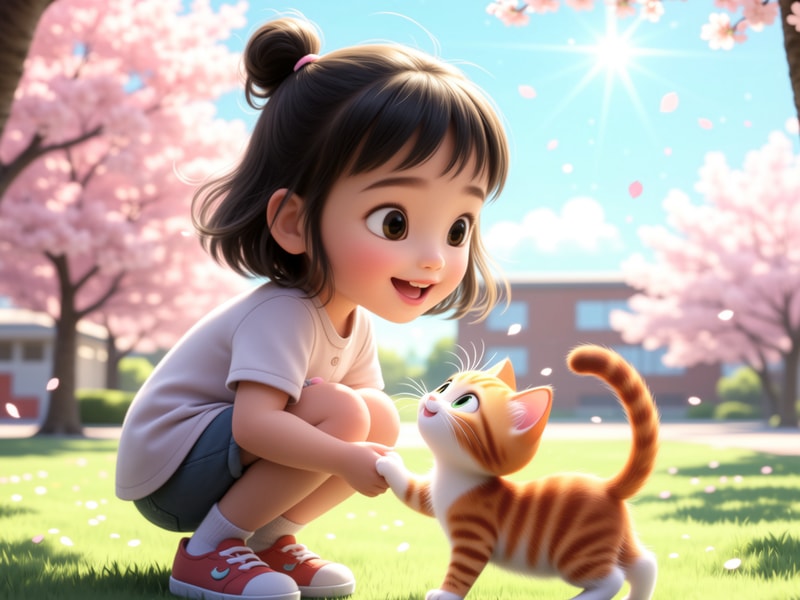 突然,一道奇特的身影从他们身边窜过,快得让人几乎看不清楚。樱樱眨了眨眼睛,发现那是一只与众不同的小猫。这只小猫看起来比普通的猫咪要壮实一些,像小象一样结实,最神奇的是,它的毛发在阳光下闪烁着彩虹般的光芒!"哇!妈妈你看!"樱樱惊叹道,"这只小猫咪好特别!"让樱樱和妈妈都没想到的是,这只特别的小猫并没有像其他校园猫咪那样躲开人类,反而转身朝他们跑了过来,就像见到了多年的老朋友一样。小猫亲昵地蹭着樱樱的腿,发出愉快的呼噜声。
