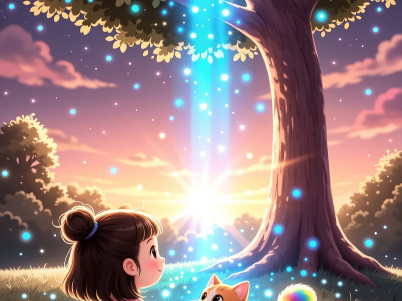 樱樱和象彩彩像每天一样,在彩虹树下歇歇脚。金色的阳光透过树叶,地上亮亮暗暗的,像在跳舞。象彩彩忽然竖起耳朵,彩虹色的毛发轻轻发光。咦?一道蓝蓝的光从天上"唰"地落下,停在彩虹树的树顶。光里好像藏着一个小小的秘密……