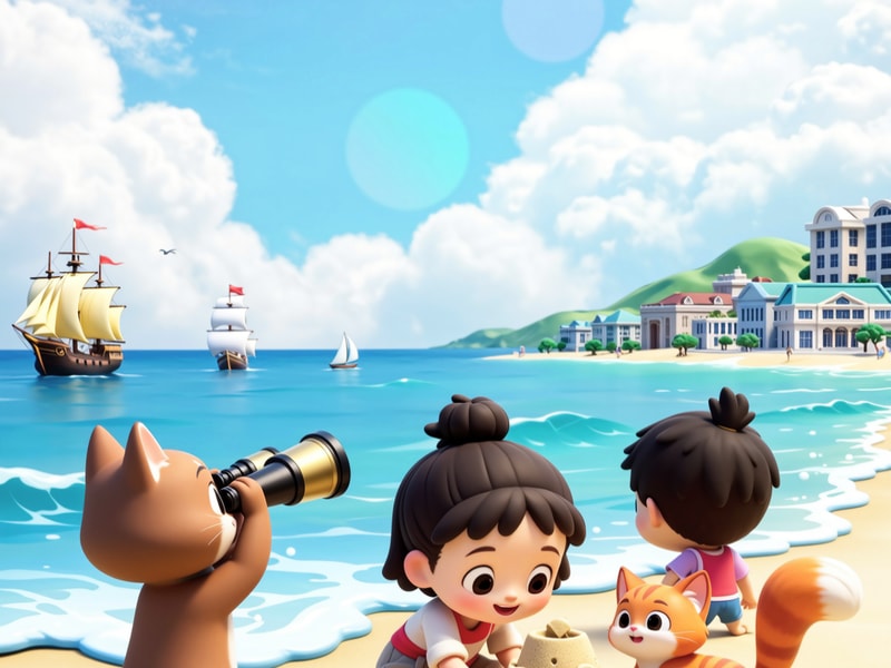 <Child mode="inline_text_zh" />开心地说:青岛的海边真美!还有红瓦绿树的老建筑呢!