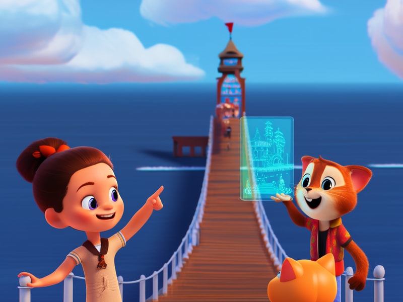 <Child mode="inline_text_zh" />兴奋地说:栈桥是青岛的标志性建筑,伸入海中的桥就像一条巨龙!