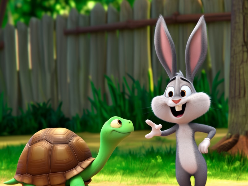 "乌龟,你爬得这么慢,我跑上山再跑下山,你可能才爬到半山腰!"兔子笑着说。