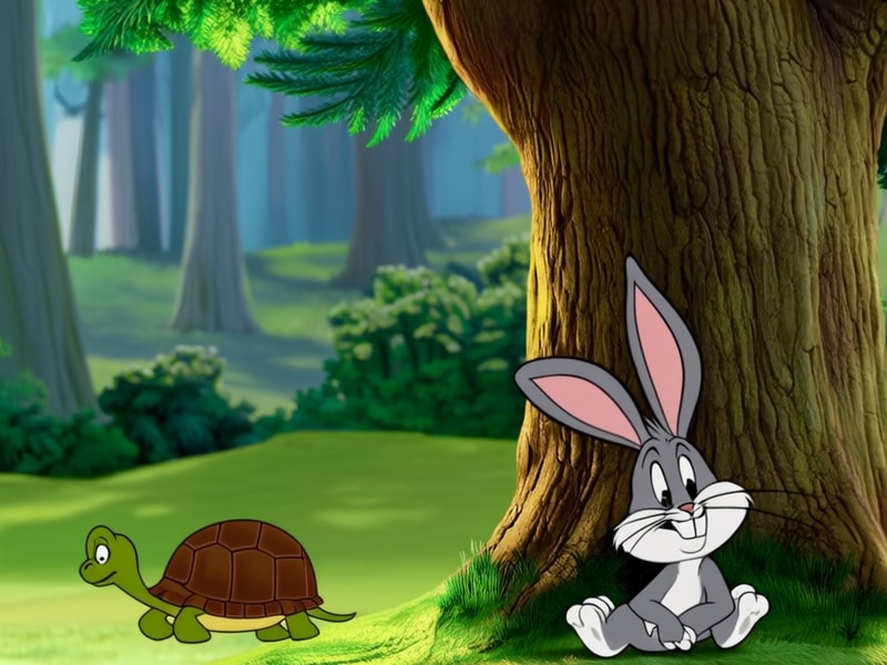 兔子心想:乌龟爬得那么慢,一时半会儿也追不上来,不如我先歇会儿。
