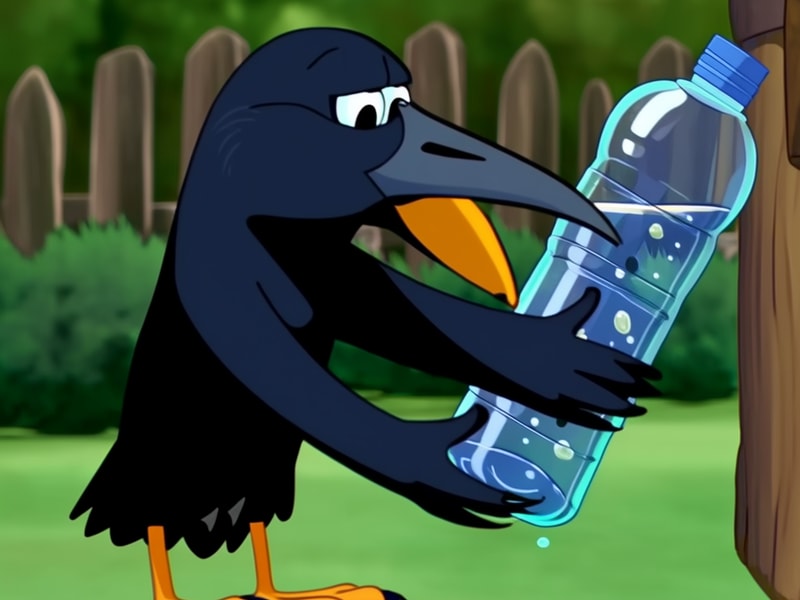乌鸦试着推倒水瓶,用头撞,用爪子抓,可水瓶却一动也不动。
