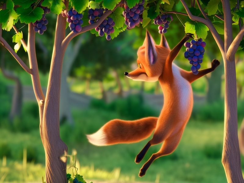狐狸试了好几次,跳得汗流浃背,还是没够着葡萄,旁边的小动物都笑了。