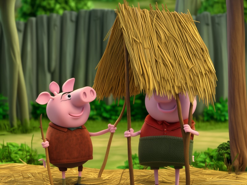 老二觉得稻草屋不结实,就用木棍建造了一座房子,比老大的要牢固一些。