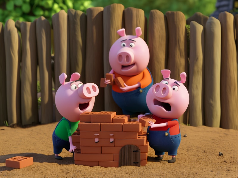 老三最勤劳,决定用砖块建造房子,虽然很辛苦,但他知道砖房会很坚固。