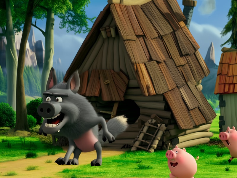 大灰狼用力一吹,木棍屋也倒塌了,两头小猪吓得赶紧跑到老三家求助。