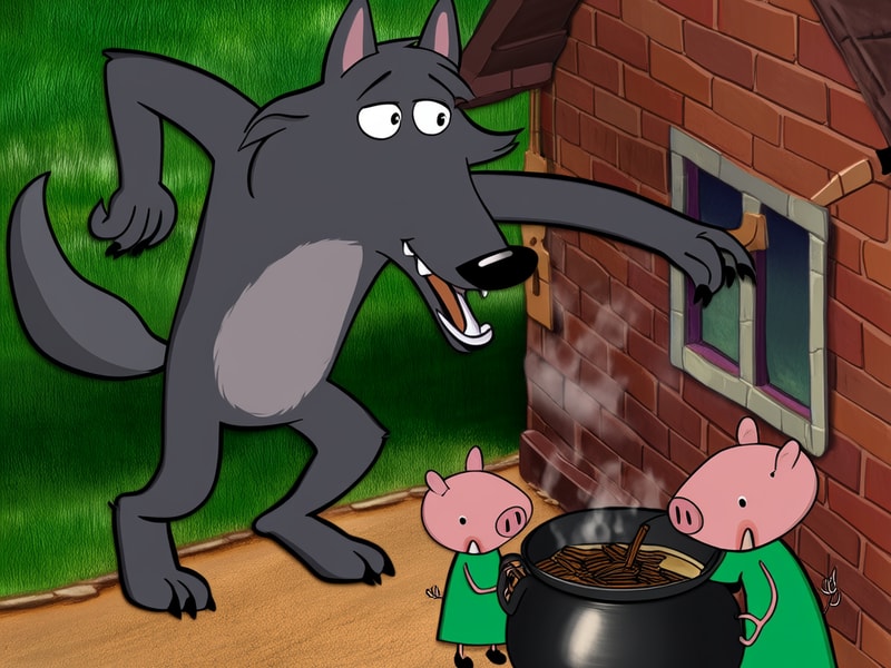 大灰狼爬到砖房的烟囱上,想要爬进去,但三只小猪在下面准备了大锅热水等着他。