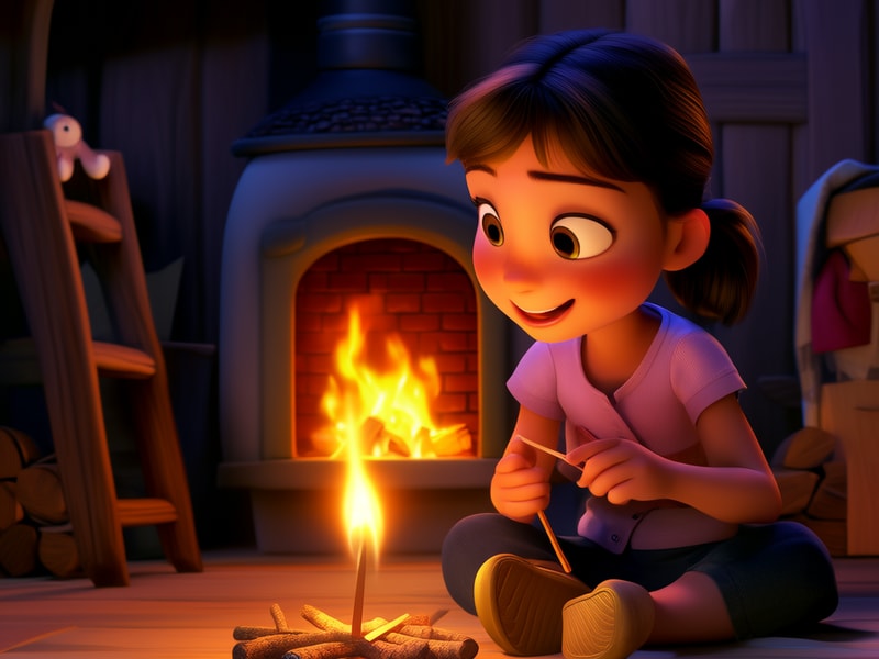 小女孩实在冷得受不了了,她点燃了一根火柴,眼前出现了一个温暖的火炉。