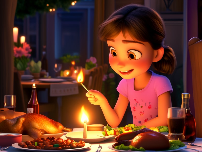 火炉消失了,小女孩又点燃了一根火柴,这次她看到了一桌丰盛的晚餐。