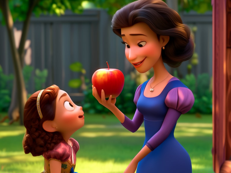 嫉妒的王后非常生气,她决定除掉白雪公主。她把自己伪装成一个老婆婆,拿着一个有毒的红苹果来到王宫。