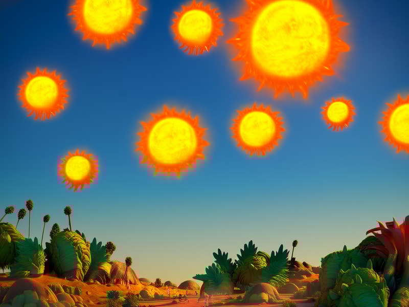 很久很久以前,天空中突然出现了十个太阳。它们轮流照耀大地,但有一天,十个太阳一起出现在天空中,大地被烤得像蒸笼一样,河流干涸,庄稼枯死,人们生活在水深火热之中。