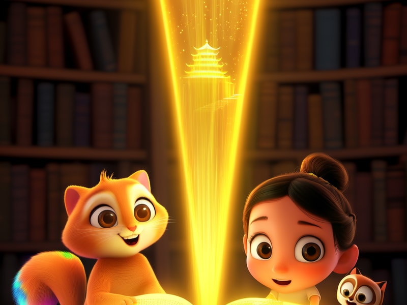 也凑过来。当书页翻开,一张古老的地图浮现出金色的光芒,上面画着一座高楼,写着:鹳雀楼。